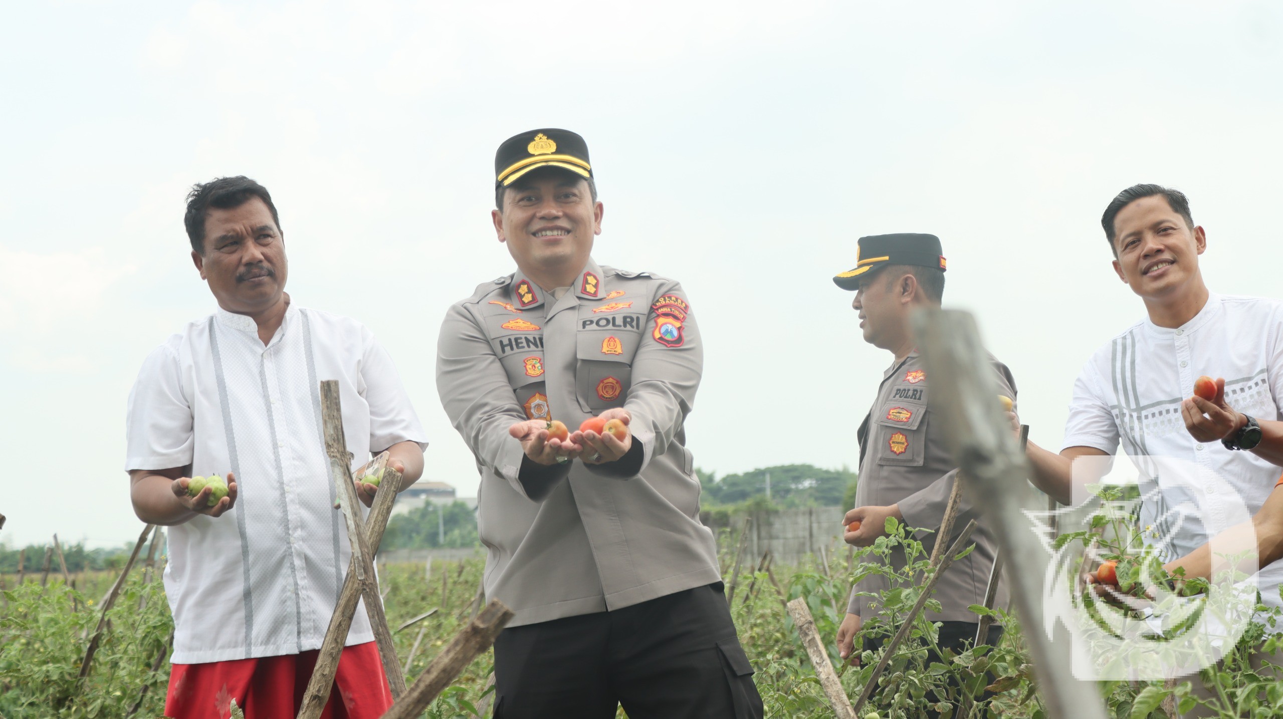 Nganjuk – Kapolres Nganjuk AKBP Henri Noveri Santoso meninjau langsung kegiatan panen raya buah tomat di lahan kebun Desa Kepuh, Kecamatan Kertosono, Kabupaten Nganjuk, pada Sabtu