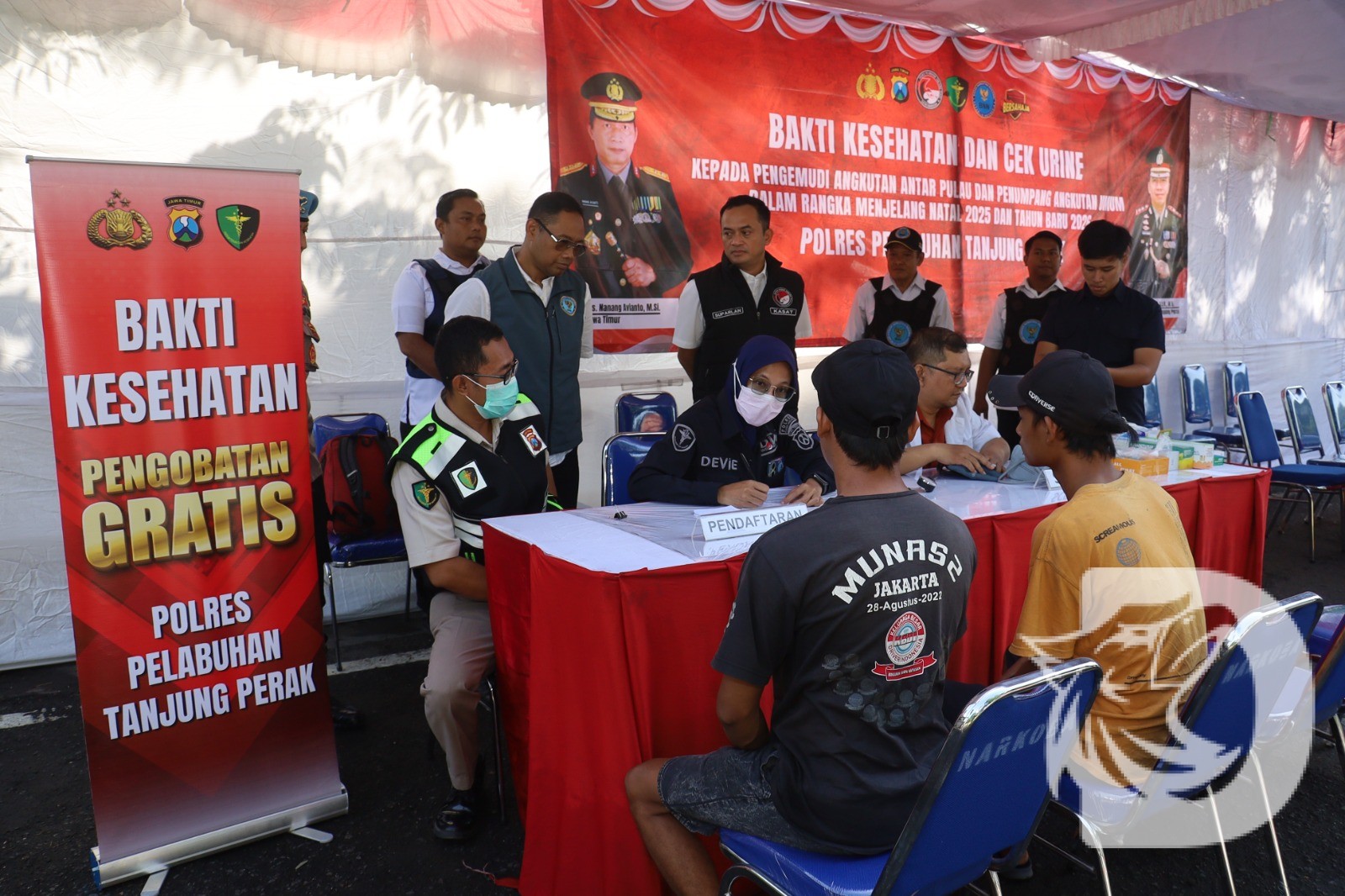 Pada Jum’at, aparat kepolisian berkolaborasi dengan BNNK Surabaya menggelar kegiatan Bakti Kesehatan dan Tes Urine bagi para pengemudi angkutan umum, angkutan antar pulau, serta ojek onlineyang melintas di kawasan Gate Pelabuhan Jamrud, Jalan Perak Timur.