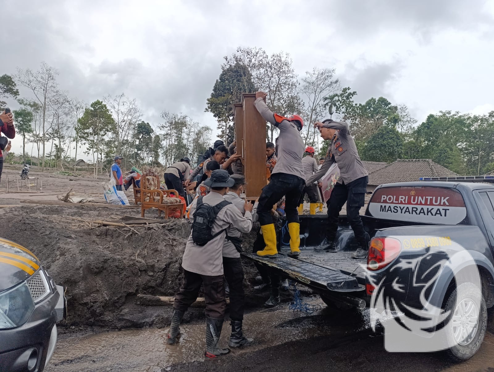Lumajang – Personel Polda Jawa Timur bersama Polres Lumajang turun langsung membantu proses evakuasi barang-barang berharga milik warga di Dusun Sumbersari, Desa Supiturang, wilayah yang terdampak erupsi Gunung Semeru, Minggu