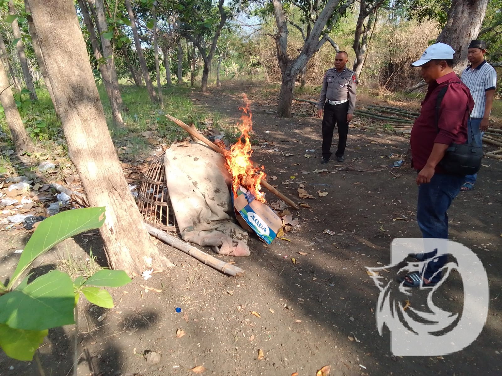 Meskipun tidak ada pelaku yang berhasil diamankan, petugas tetap mengambil tindakan tegas. Sejumlah barang bukti berupa terpal dan kurungan ayam yang digunakan dalam kegiatan sabung ayam langsung dimusnahkan dengan cara dibakar di tempat untuk mencegah kegiatan serupa terulang.