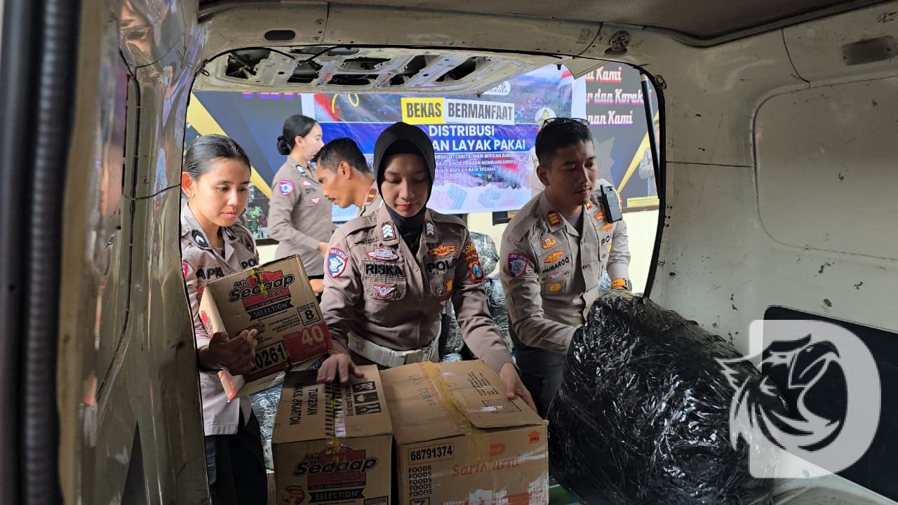Kota Mojokerto – Wujud kepedulian Bencana di Aceh, Sumatera Utara dan Sumatera Barat, Polres Mojokerto Kota Polda Jatim melalui Satuan Lalu Lintasmenyalurkan paket bantuan untuk para korban bencana, Senin
