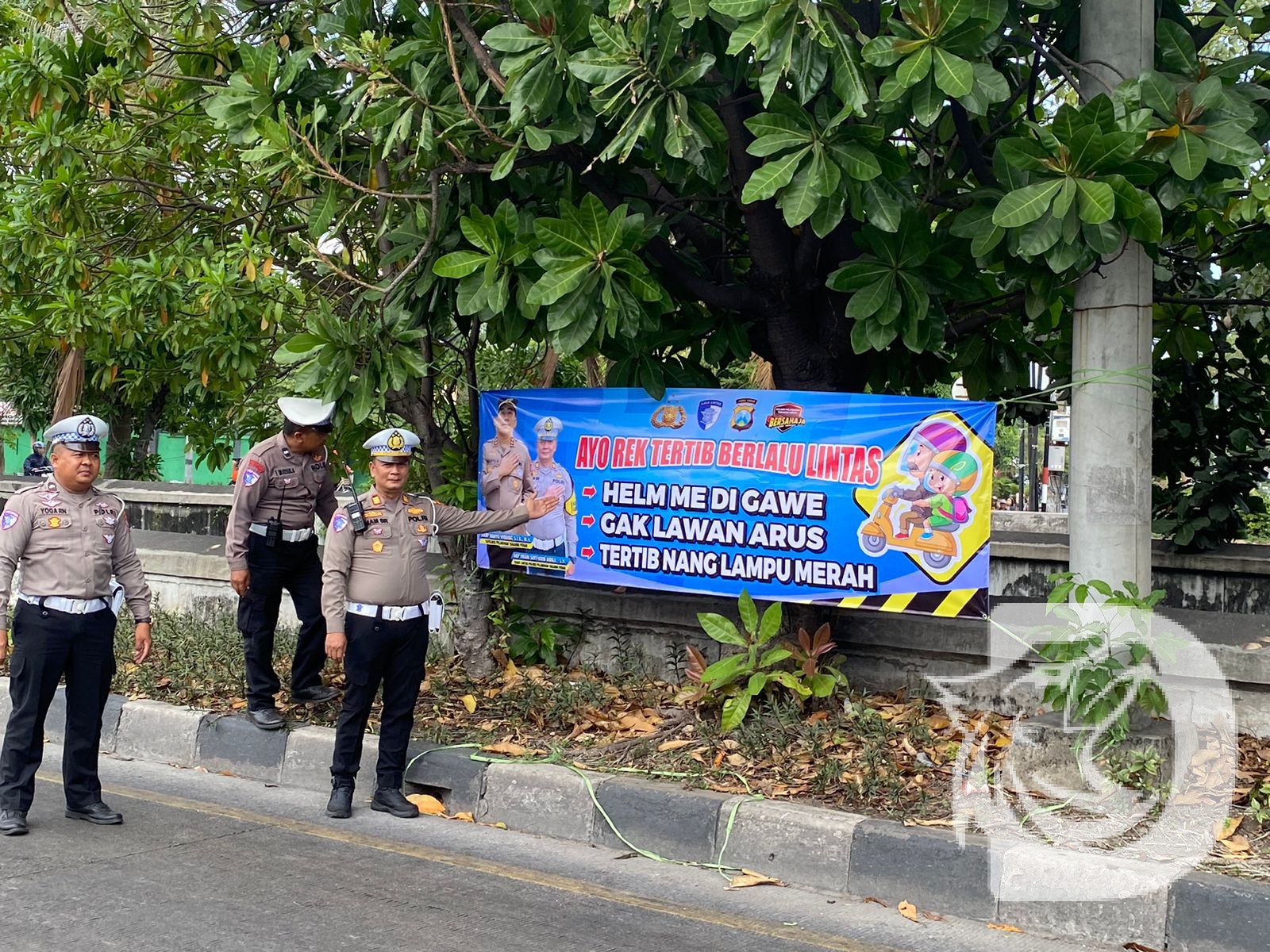 Selain memberikan teguran simpatik, petugas juga memasang spanduk berukuran besar di titik strategis. Spanduk tersebut menggunakan bahasa yang khas dan mudah dipahami masyarakat Surabaya, bertuliskan “Ayo Rek Tertib Berlalulintas, Helem me Digawe, Gak Lawan Arus, Tertib Nang Lampu Merah.”